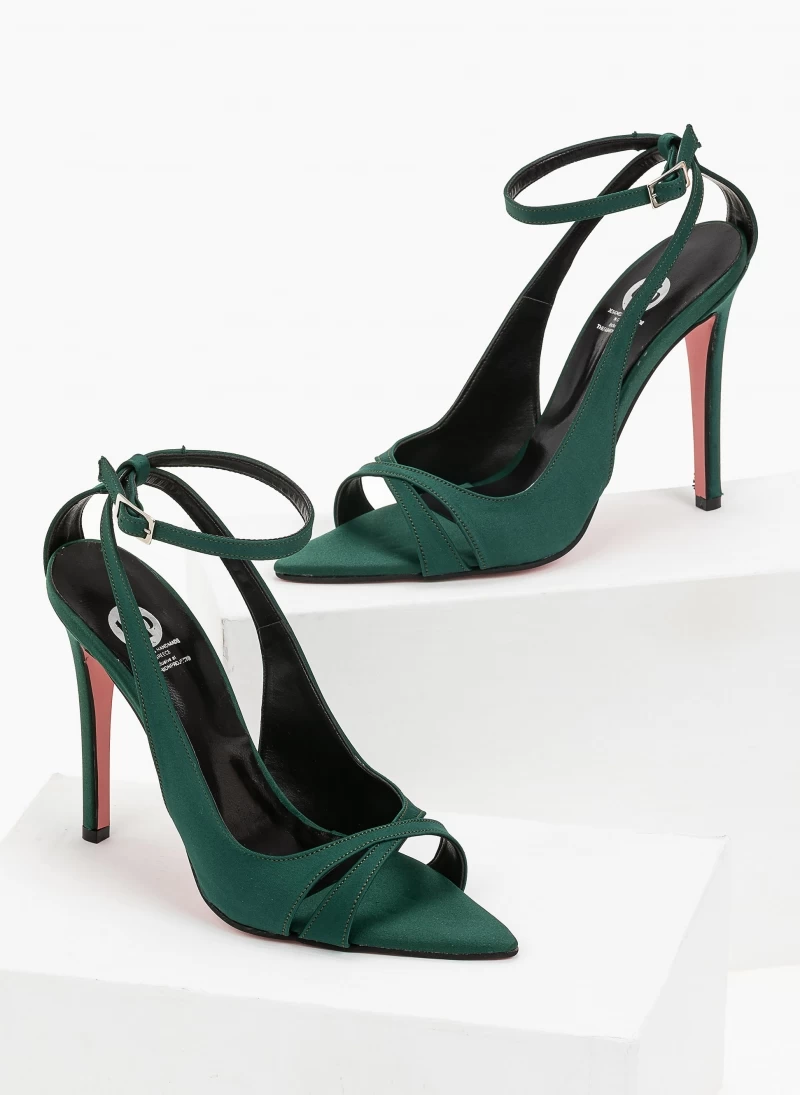 TFP μυτερά σατέν πέδιλα. Έχουν χιαστί λοράκια και δένουν στο ύψος του αστραγάλου. Δερμάτινος πάτος. Ελληνικής κατασκευής.