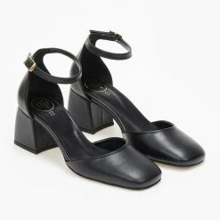 Γόβες tfp με χαμηλό τετράγωνο τακούνι. Έχουν ανοιχτά πλαϊνά. Κλειστή φτέρνα. Δένουν με μπαρέτα στο ύψος του αστραγάλου. Δερμάτινος πάτος. Ελληνικής κατασκευής.