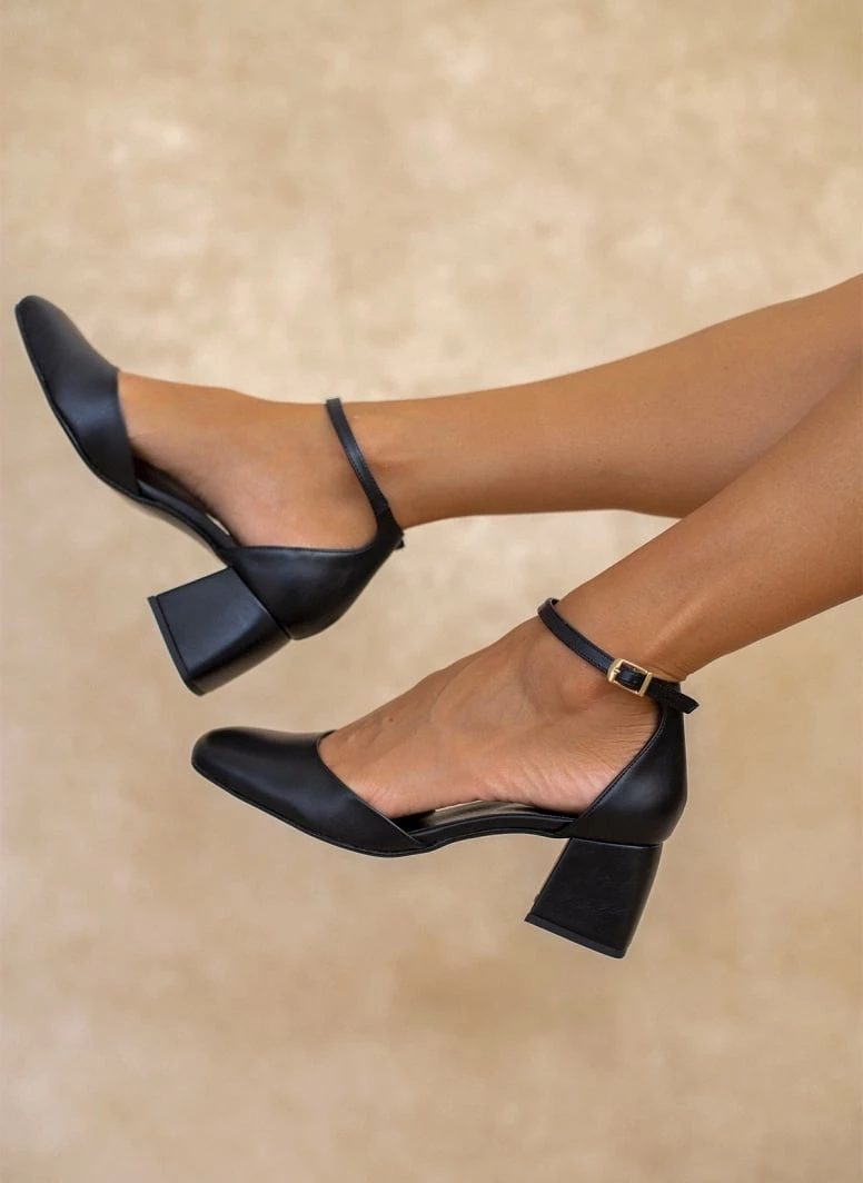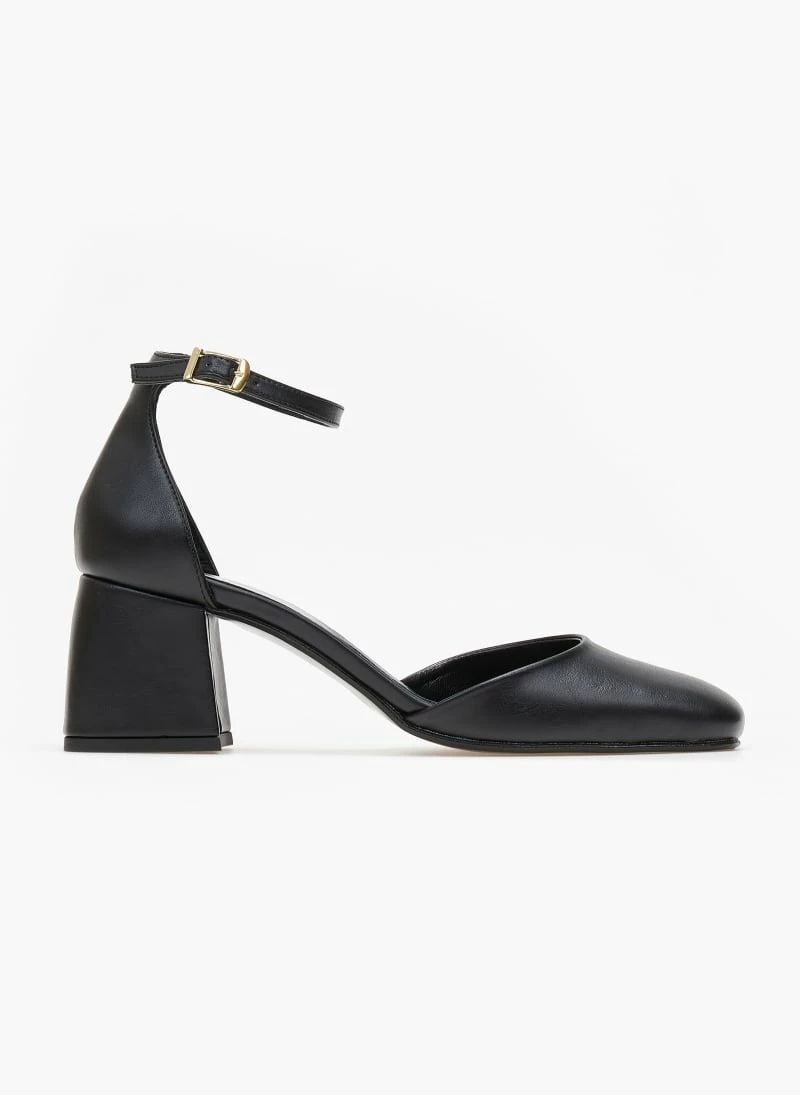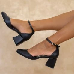 Γόβες tfp με χαμηλό τετράγωνο τακούνι. Έχουν ανοιχτά πλαϊνά. Κλειστή φτέρνα. Δένουν με μπαρέτα στο ύψος του αστραγάλου. Δερμάτινος πάτος. Ελληνικής κατασκευής.