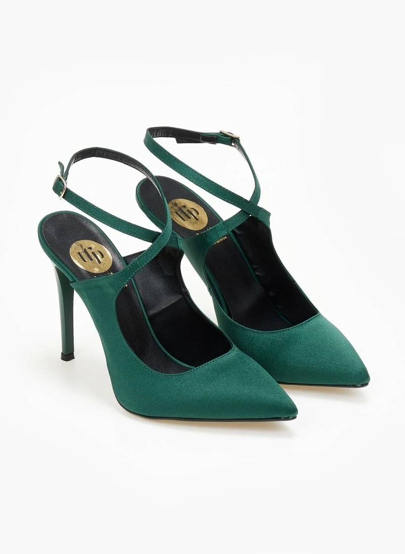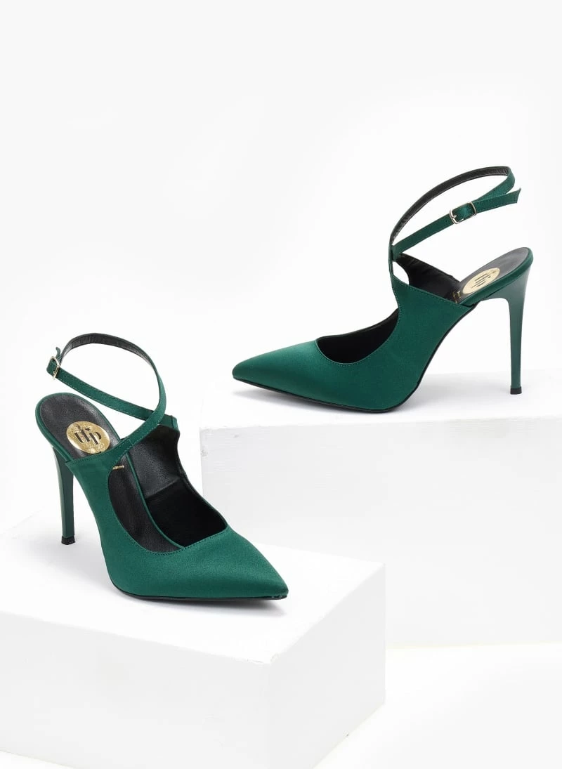 Γόβες ανοιχτές σατέν tfp. Δένουν με χιαστί λουράκι στο ύψος του κουτεπιέ. Ανοιχτή φτέρνα. Ελληνικής κατασκευής.