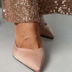 Γόβες σατέν μυτερές tfp. Δένουν με χιαστί λουράκι στο ύψος του ατσραγάλου. V cut σχέδιο στα δάκτυλα. Δερμάτινος πάτος. Ελληνικής κατασκευής.