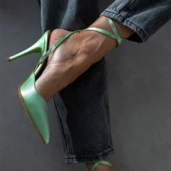 Γόβες μυτερές με ψηλό λεπτό τακούνι. Δένουν στο ύψος του αστραγάλου με χιαστί λουράκι. Δερμάτινος πάτος. Ελληνικής κατασκευής.