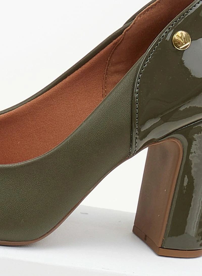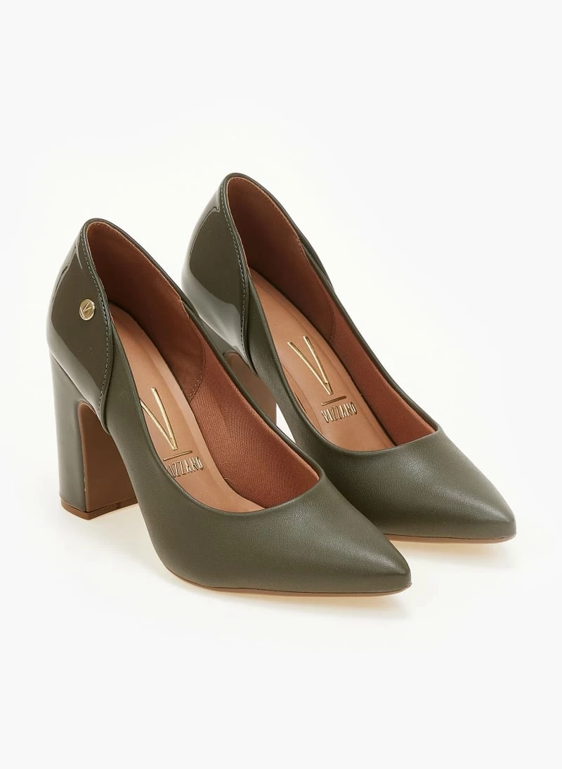 Γόβες μυτερές VIZZANO με ψηλό χοντρό τακούνι. Συνδυάζουν τεχνόδερμα και λουστρίνι. Διαθέτουν ανατομικό μαξιλαράκι στο πέλμα. Λάστιχο στη σόλα.
