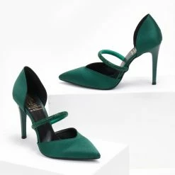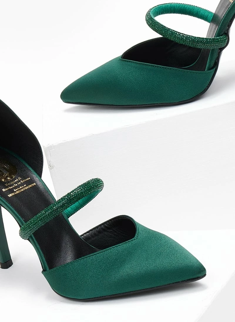 Γόβες μυτερές σατέν tfp με ανοιχτά πλαϊνά. Έχουν strass λουράκι στο ύψος του κουτεπιέ. Κλειστή φτέρνα. Σχέδιο v cut στα δάκτυλα. Ελληνικής κατασκευής.