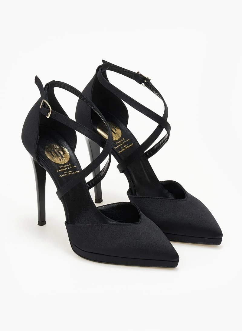 Γόβες σατέν με λεπτή φιάπα και ανοιχτά πλαϊνά tfp exclusive. Έχουν χιαστί δέσιμο στο ύψος του κουτεπιέ. Μυτερή φόρμα με v cut άνοιγμα. Η φτέρνα είναι κλειστή. Ελληνικής κατασκευής.