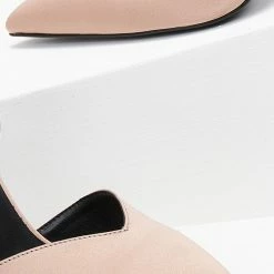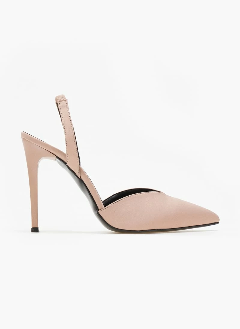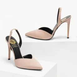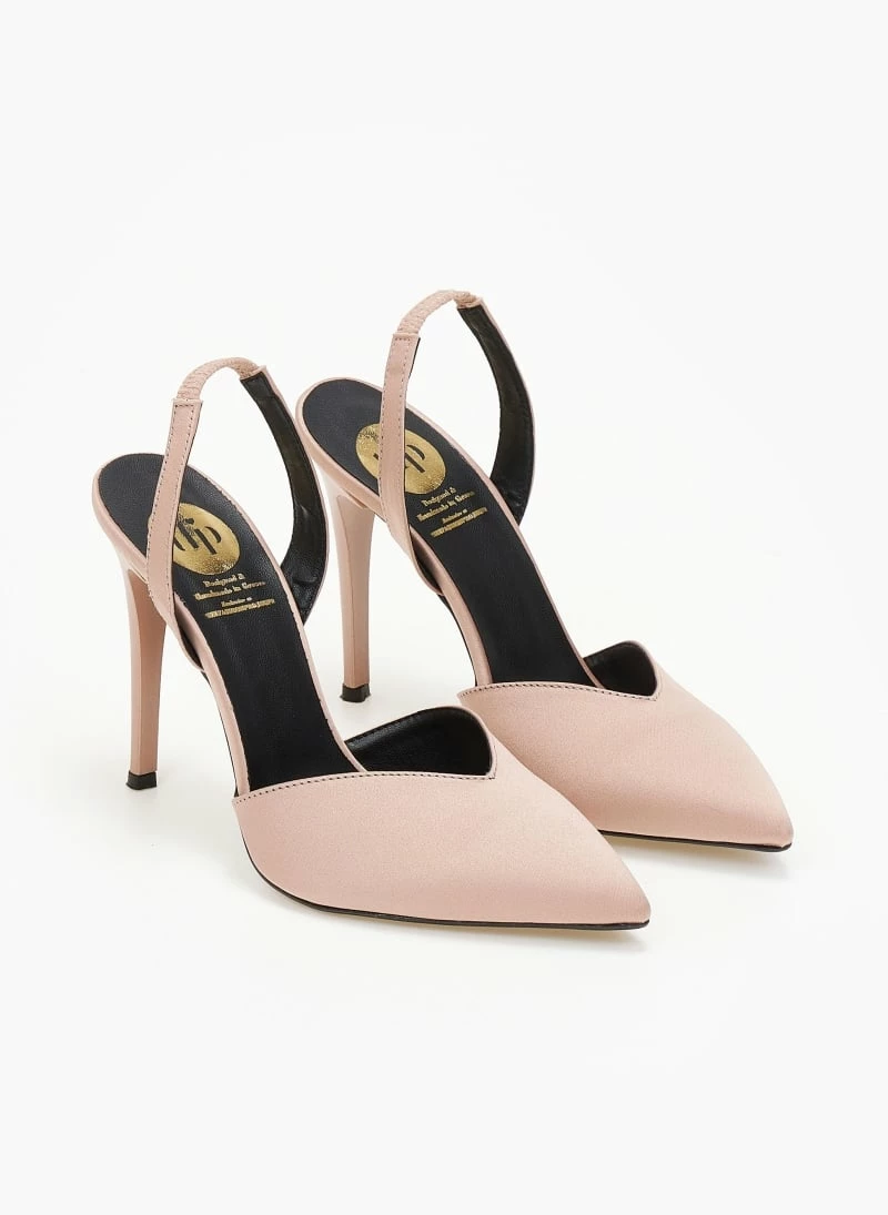 Γόβες σατέν μυτερέςtfp . Έχουν ανοιχτή φτέρνα με λουράκι. V cut σχέδιο στα δάκτυλα. Ελληνικής κατασκευής.