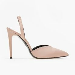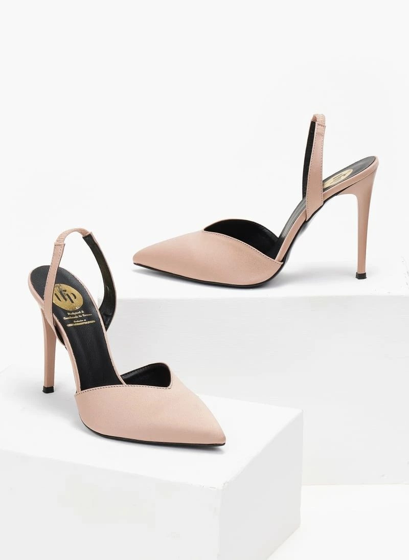 Γόβες σατέν μυτερέςtfp . Έχουν ανοιχτή φτέρνα με λουράκι. V cut σχέδιο στα δάκτυλα. Ελληνικής κατασκευής.