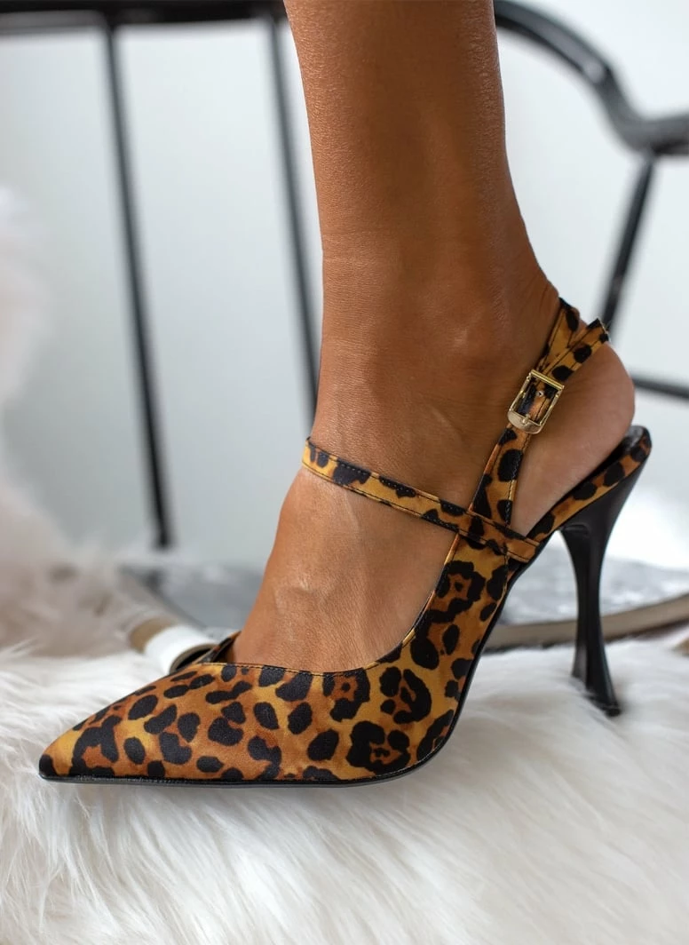 Γόβες σατέν με print tfp. Έχουν λοξό λουράκι στο κουτεπιέ. Δένουν στο πλάι. Μυτερή φόρμα με v cut σχέδιο στα δάκτυλα. Ψηλό λεπτό τακούνι. Δερμάτινος πάτος. Ελληνικής κατασκευής.