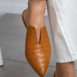 Mules χωρίς τακούνι με pattern κροκό. Είναι μυτερά και έχουν άνοιγμα. Ελληνικής κατασκευής.