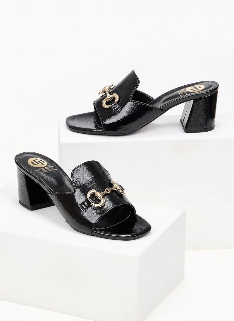 Mules λουστρίνι tfp με χαμηλό τακούνι.Έχει φαρδιά φάσα με κοψίματα και μεταλλικό διακοσμητικό.Ελληνικής κατασκευής.