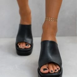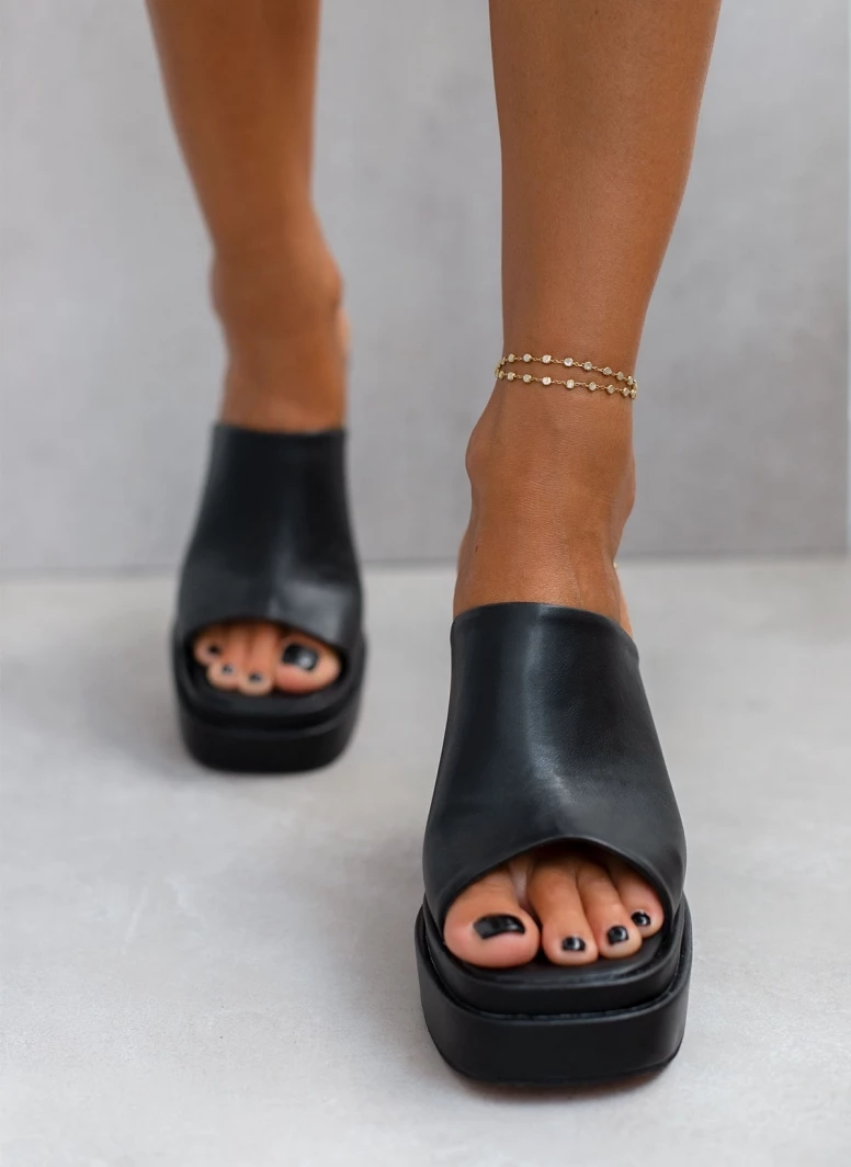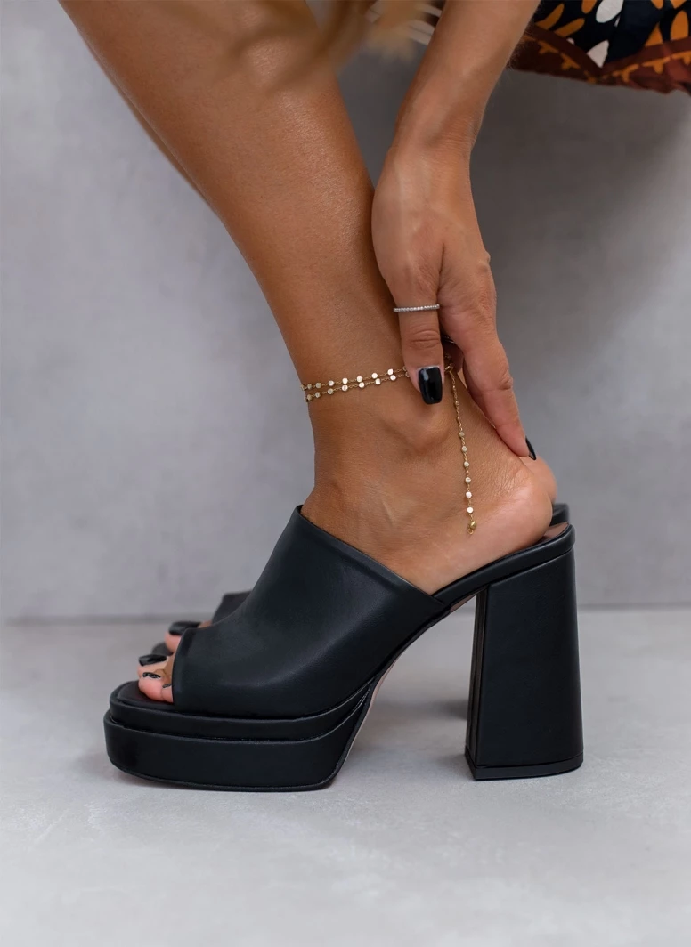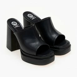 Mules tfp με χοντρό ιδιαίτερο τακούνι και φιάπα. Έχει καρέ γραμμή και χωστή φάσα.
