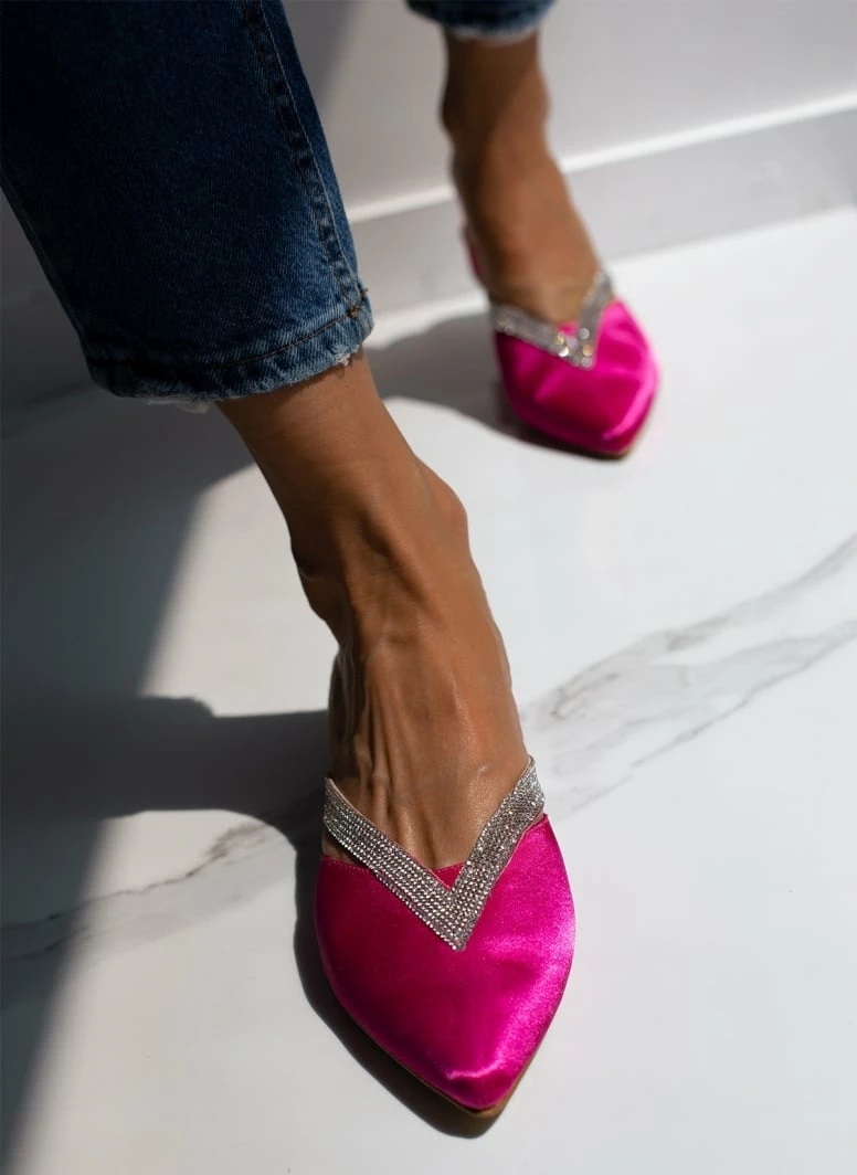 Mules σατέν tfp μυτερά με ανοίγματα στο πλάι. Έχουν strass λεπτομέρεια σε v σχήμα. Δερμάτινος πάτος και επένδυση. Ελληνικής κατασκευής.