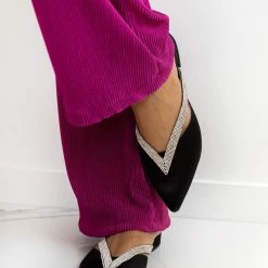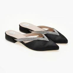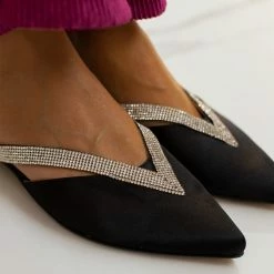 Mules σατέν tfp μυτερά με ανοίγματα στο πλάι. Έχουν strass λεπτομέρεια σε v σχήμα. Δερμάτινος πάτος και επένδυση. Ελληνικής κατασκευής.