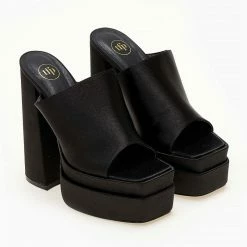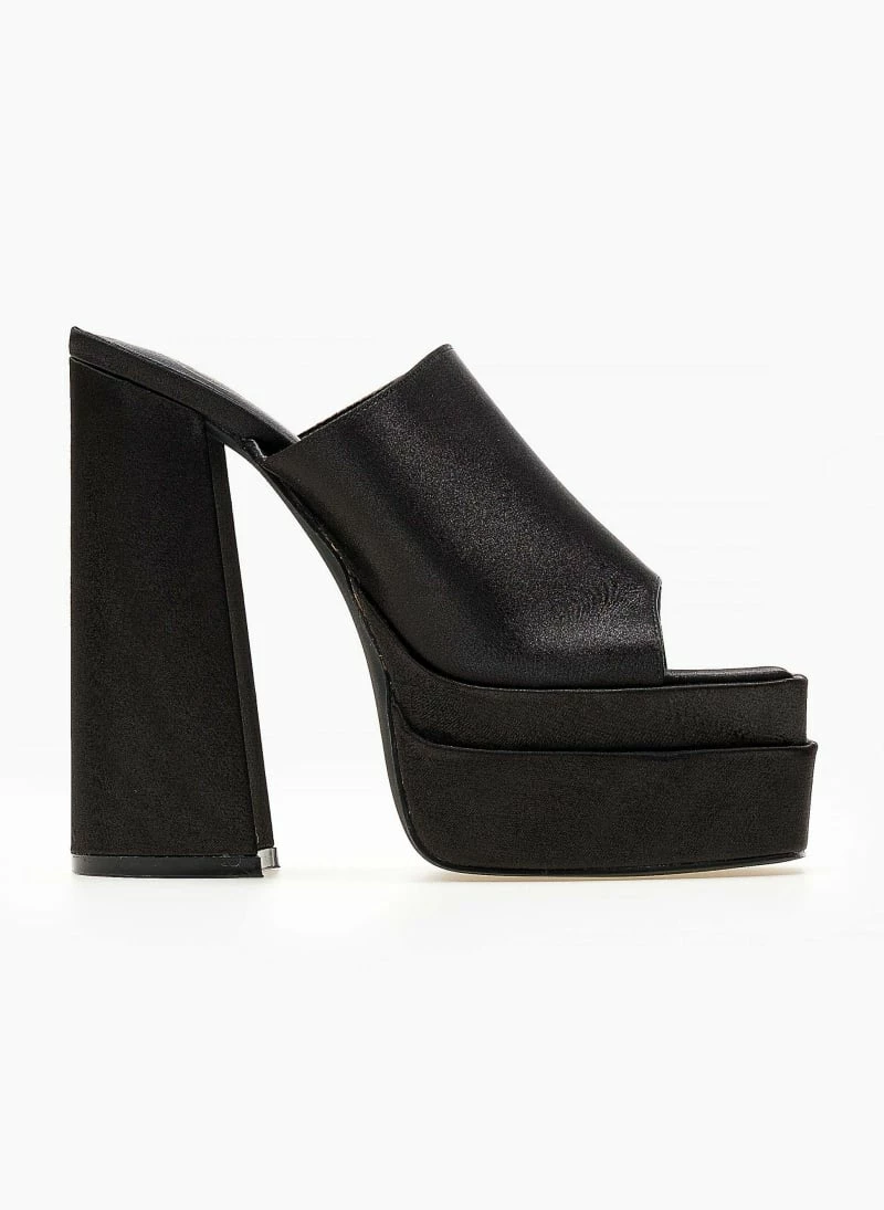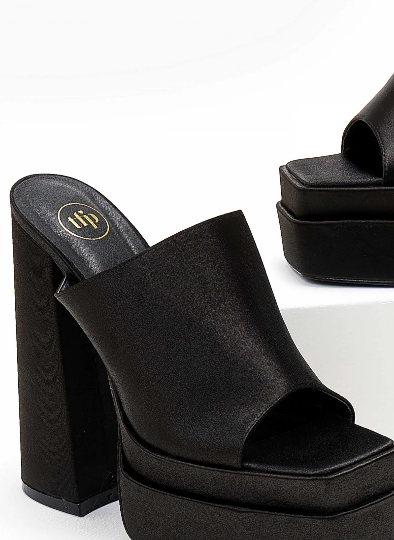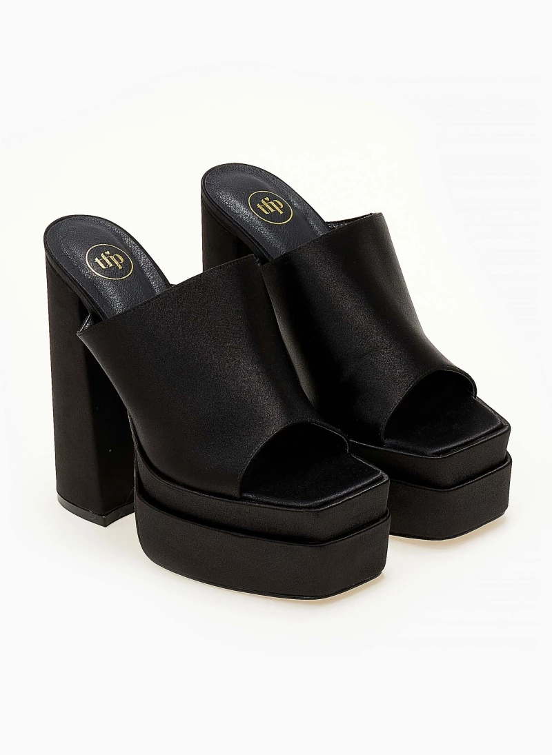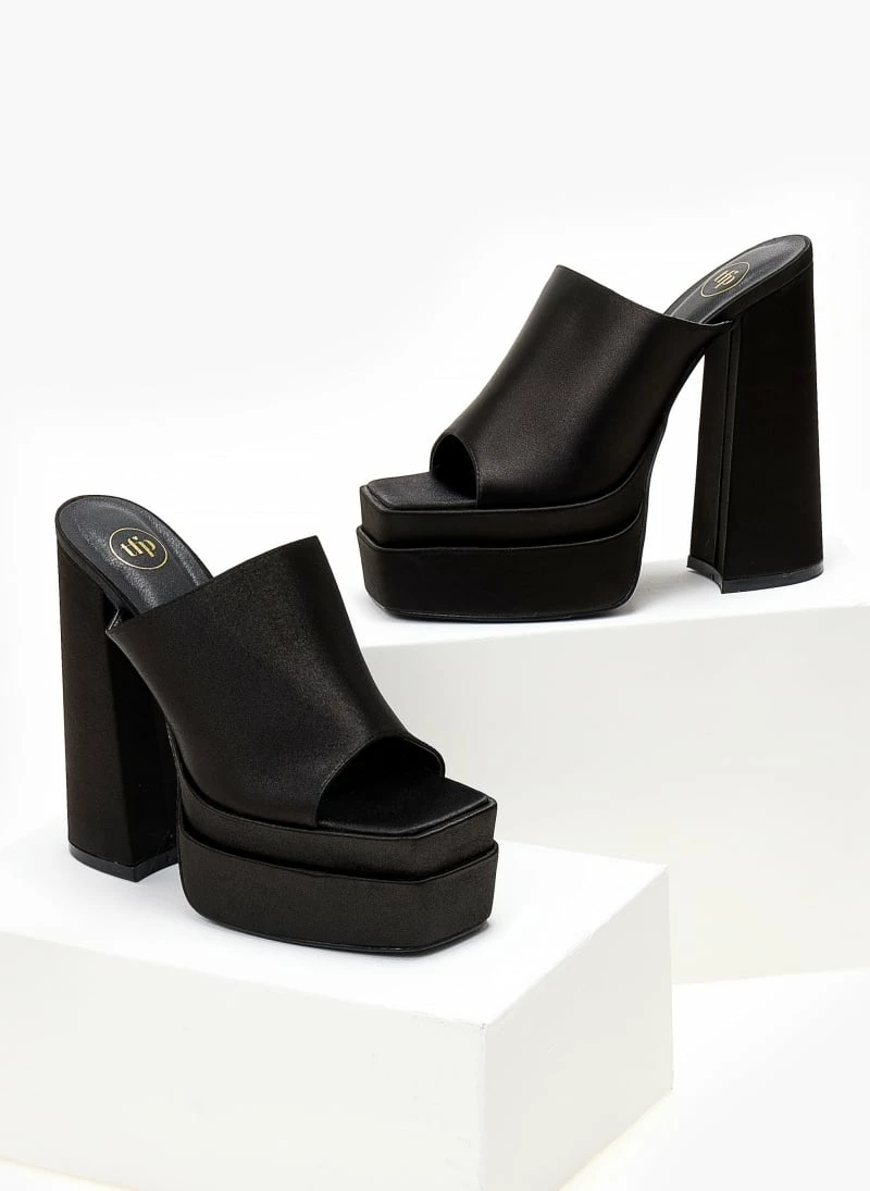 TFP Mules σατέν με platform τακούνι και ψηλή φιάπα. Έχουν φαρδιά φάσα. Καρέ γραμμή.
