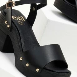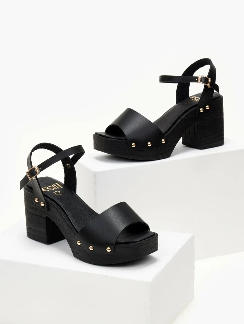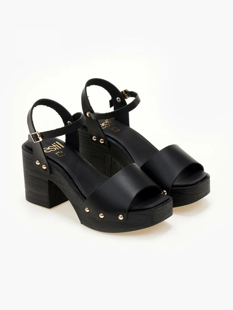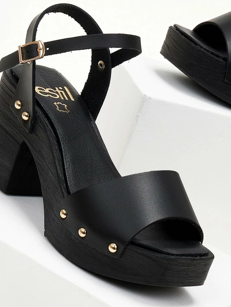 Πέδιλα δερμάτινα Estil με ξύλινη σόλα – Μαύρο