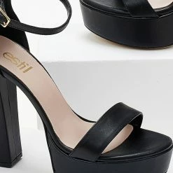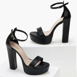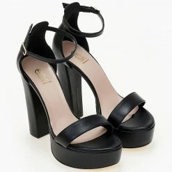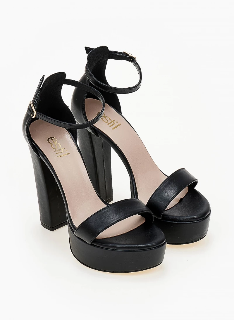 Πέδιλα Estil με φιάπα και ψηλό χοντρό τακούνι. Η φτέρνα είναι κλειστή δένουν με μπαρέτα στο ύψος του αστραγάλου. Ελληνικής κατασκευής.