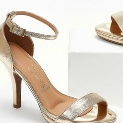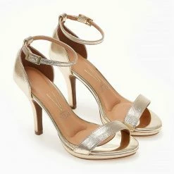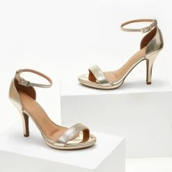 Πέδιλα σε μεταλλικό χρώμα με φιάπα. Έχουν κλειστή φτέρνα. Δένουν με μπαρέτα στο ύψος του αστραγάλου.