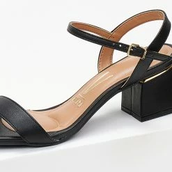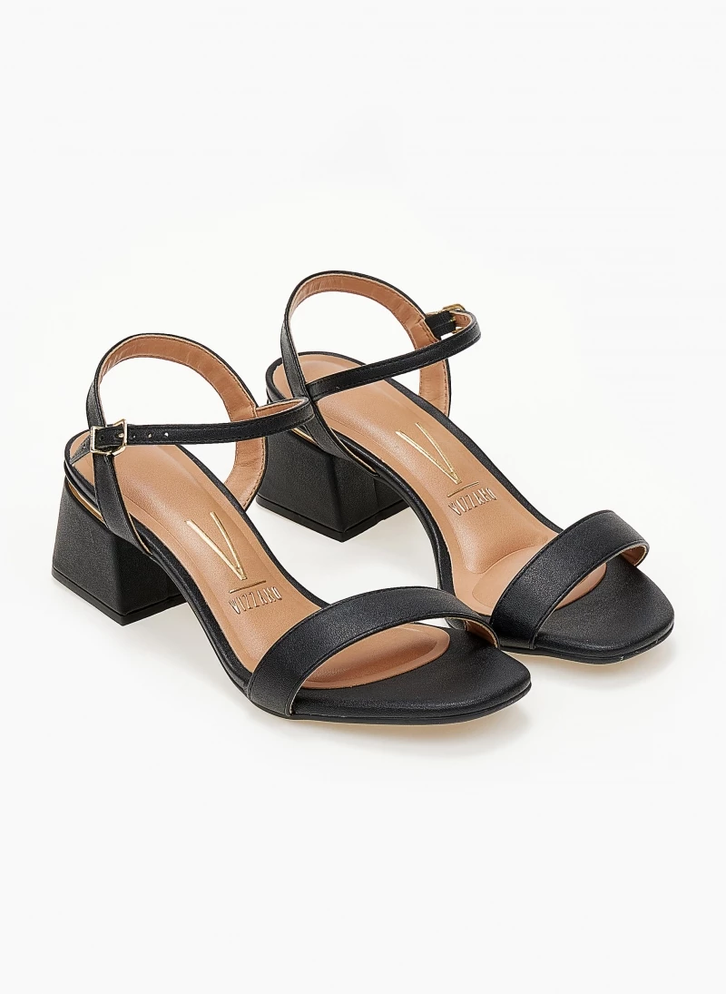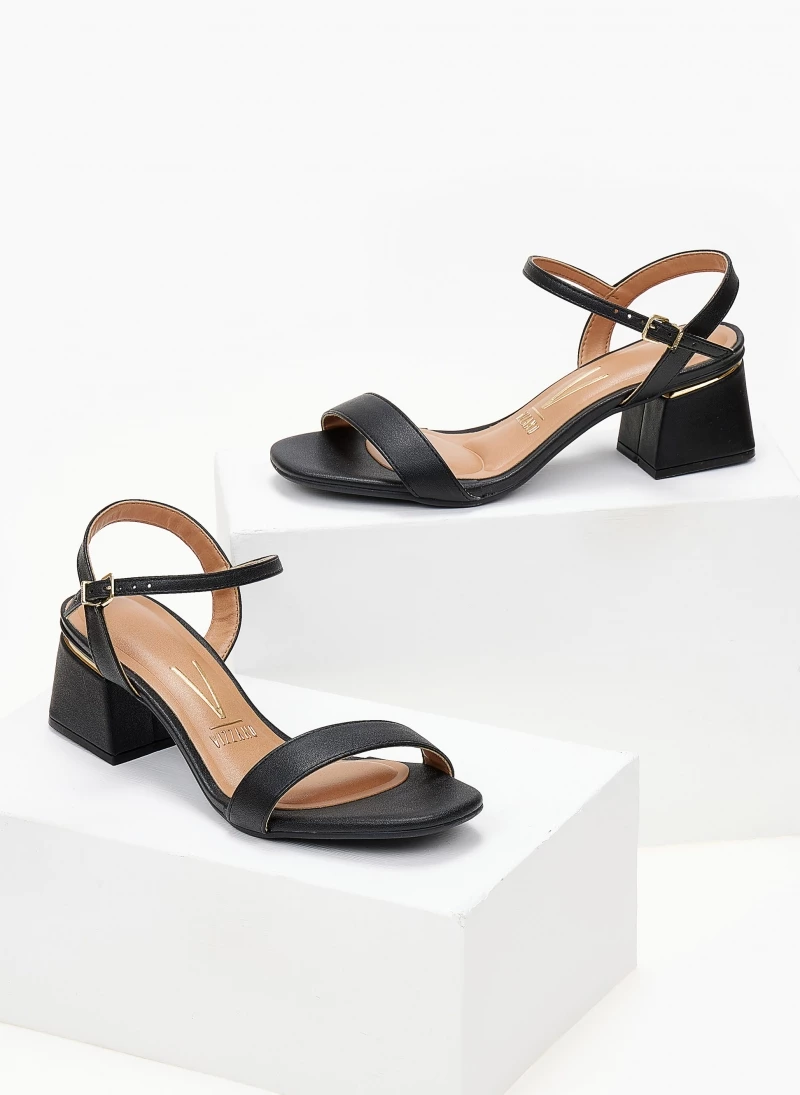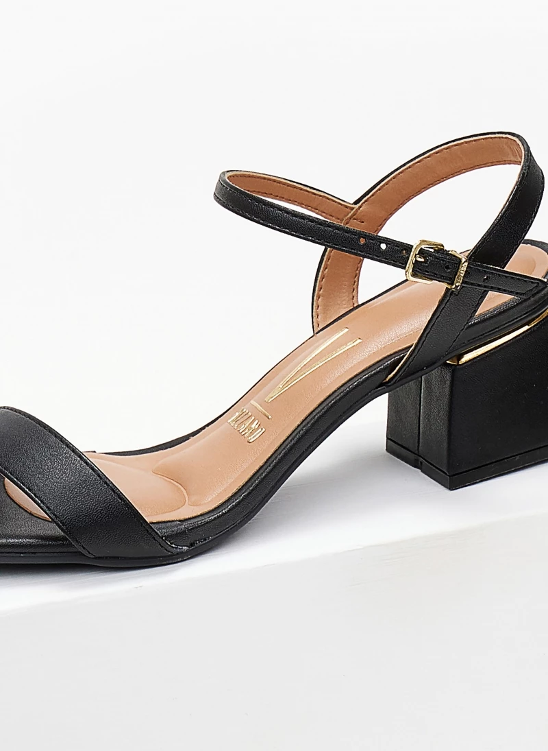Πέδιλα VIZZANO με χαμηλό τετράγωνο τακούνι και μεταλλική λεπτομέρεια. Έχουν μαλακό μαξιλαράκι στον πάτο. Δένουν με μπαρέτα στο ύψος του κουτεπιέ.