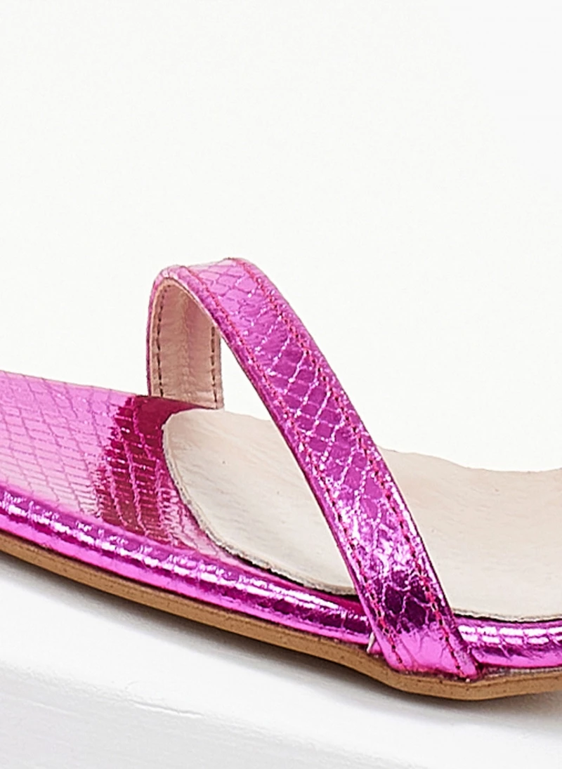 Πέδιλα TFP σε μεταλλικά χρώματα με pattern φίδι. Έχουν λεπτό ψηλό τακούνι. Καρέ γραμμή. Διακριτικό διακοσμητικό με μικρά strass στο πλάι. Δερμάτινος πάτος. Ελληνικής κατασκευής.