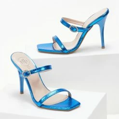 Πέδιλα TFP σε μεταλλικά χρώματα με pattern φίδι. Έχουν λεπτό ψηλό τακούνι. Καρέ γραμμή. Διακριτικό διακοσμητικό με μικρά strass στο πλάι. Δερμάτινος πάτος. Ελληνικής κατασκευής.