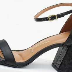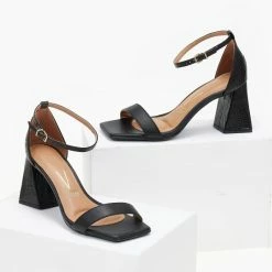 Πέδιλα σε καρέ γραμμή με λεπτή φάσα. Έχουν ανάγλυφο pattern στο πίσω μέρος και το τακούνι. Κλειστή φτέρνα. Δένουν με μπαρέτα στο ύψος του αστραγάλου. Διαθέτουν ενίσχυση με μαξιλαράκι στον πάτο.