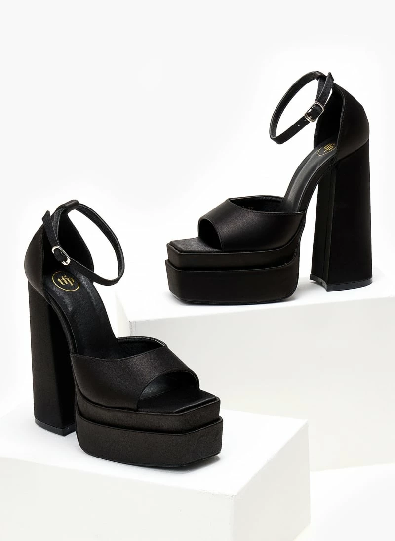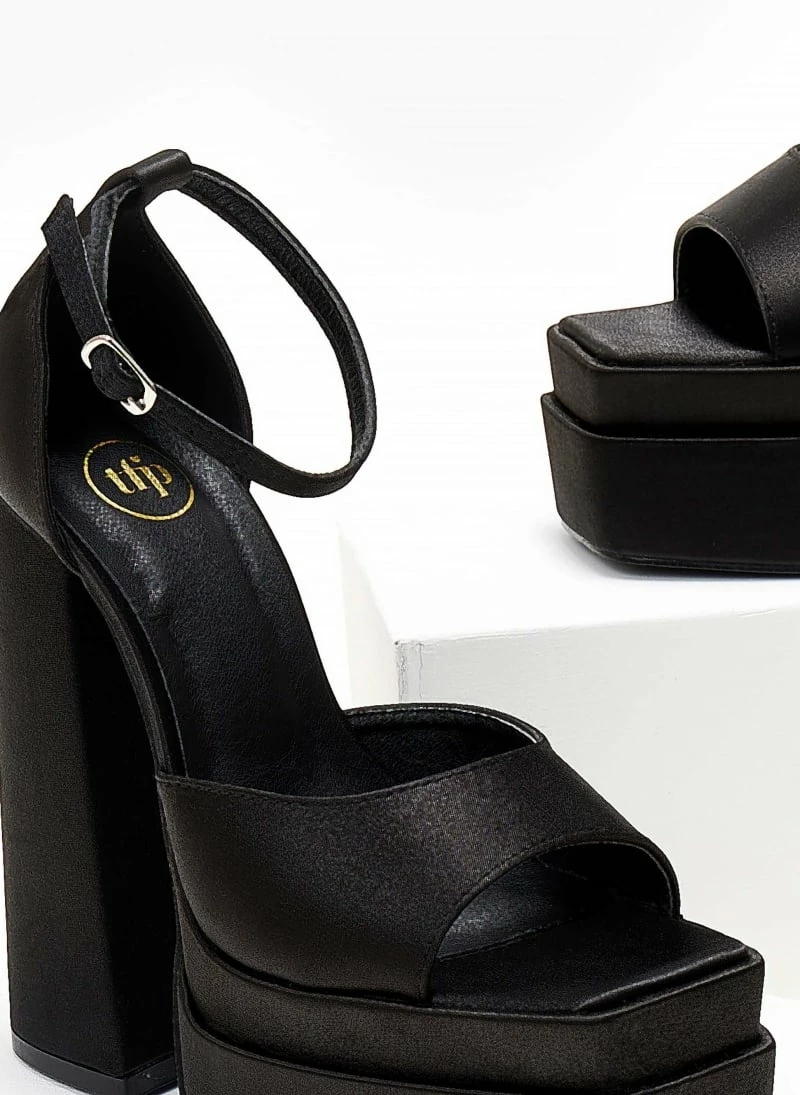 Πέδιλα platform σατέν TFP.Έχουν ψηλή φιάπα και χοντρό τακούνι. Κλειστή φτέρνα. Δένουν με μπαρέτα στο ύψος του αστραγάλου. Καρέ γραμμή.