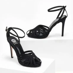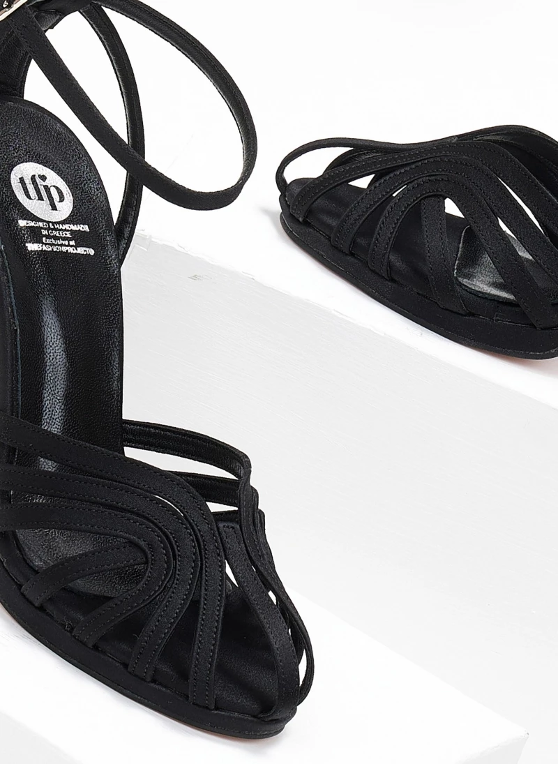Πέδιλα σατέν tfp με ρετρό σχέδιο. Δένουν με μπαρέτα στο ύψος του αστραγάλου. Έχουν λεπτή φιάπα. Ελληνικής κατασκευής