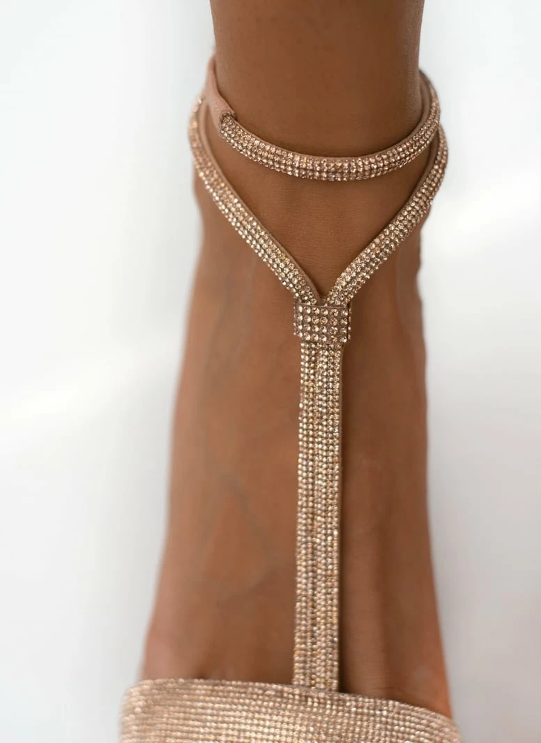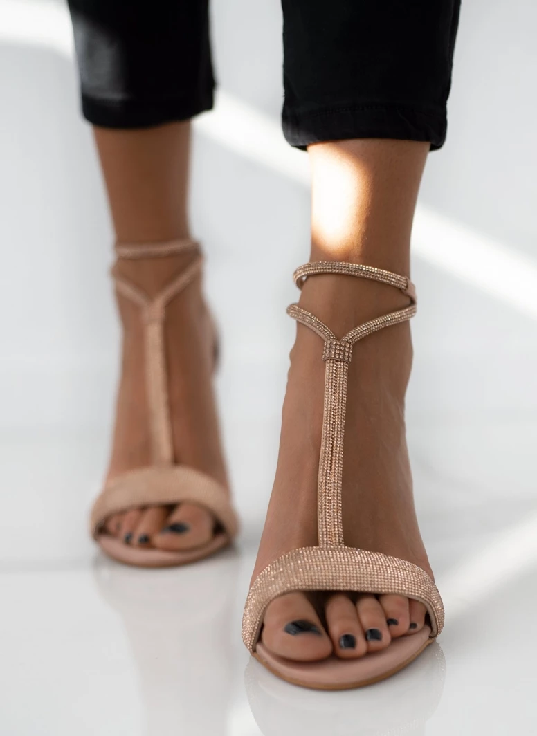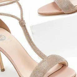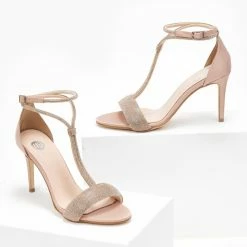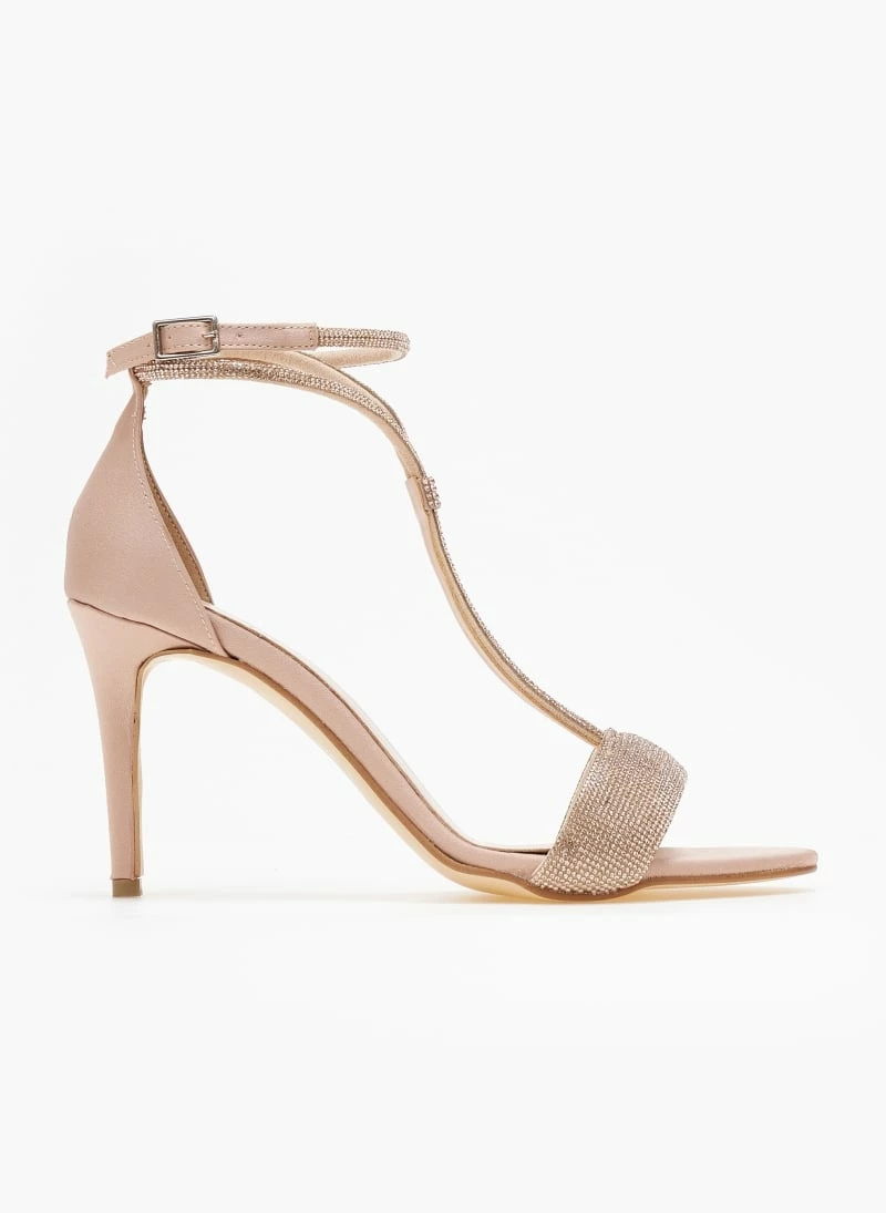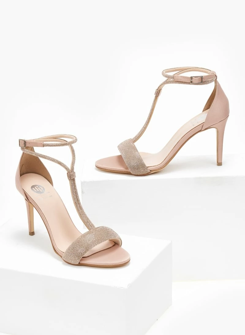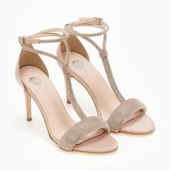 Πέδιλα σατέν tfp με strass φάσα και μπαρέτα. Έχουν κλειστή φτέρνα. Δένουν στο ύψος του αστραγάλου. Ελληνικής κατασκευής.