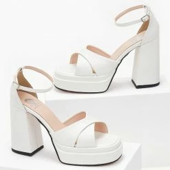 Πέδιλα TFP με χιαστί φάσες. Έχουν διπλή φιάπα και ψηλό χοντρό τακούνι. Δένουν με μπαρέτα στο ύψος του αστραγάλου. Κλειστή φτέρνα. Ελληνικής κατασκευής.