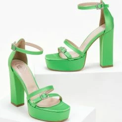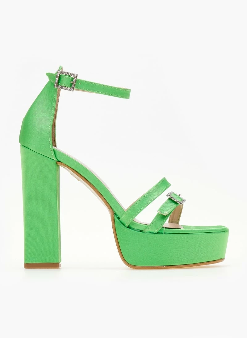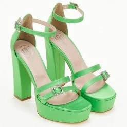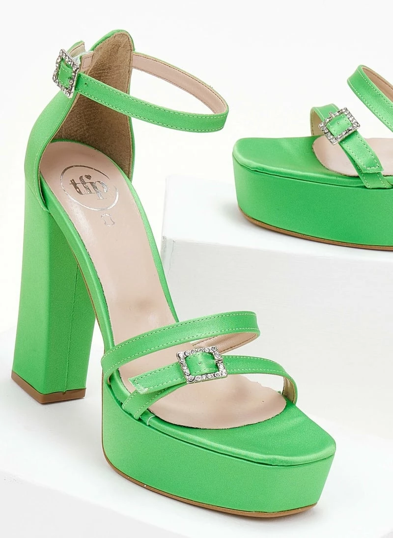 Πέδιλα με διπλό λουράκι και strass λεπτομέρεια. Έχουν φιάπα και ψηλό τακούνι. Η φτέρνα είναι κλειστή. Δένουν με μπαρέτα στο ύψος του αστραγάλου. Καρέ γραμμή. Δερμάτινος πάτος. Ελληνικής κατασκευής.
