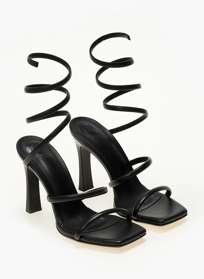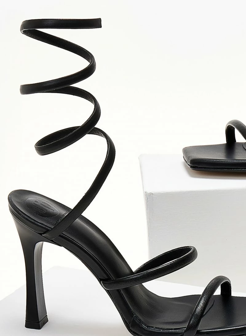 Πέδιλα TFP με λεπτά λουράκια με κρύσταλλα. Έλασμα σπιράλ στο ύψος της γάμπας. Έχουν λεπτό ψηλό τακούνι. Ελληνικής κατασκευής,χειροποίητα.