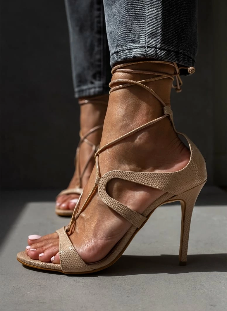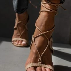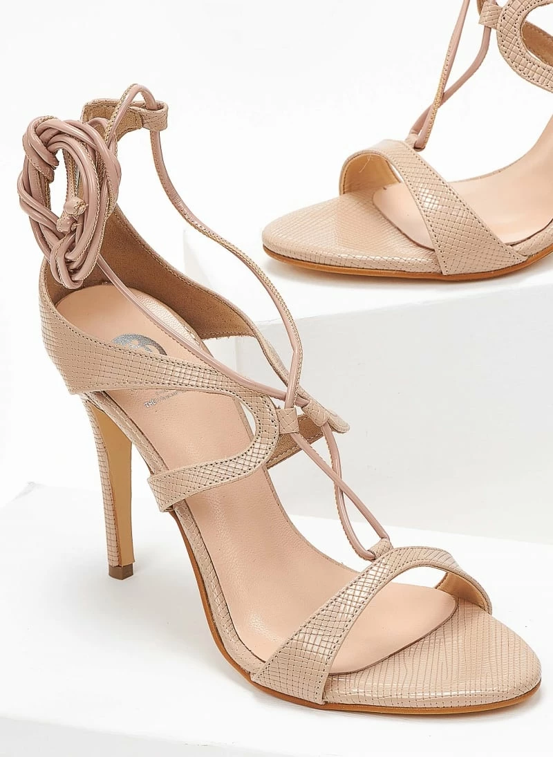 Πέδιλα με δέσιμο στη γάμπα.Έχουν κλειστή φτέρνα και ψηλό τακούνι.Ελληνικής κατασκευής.