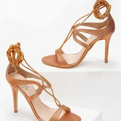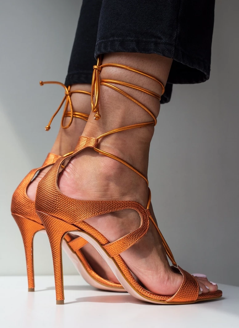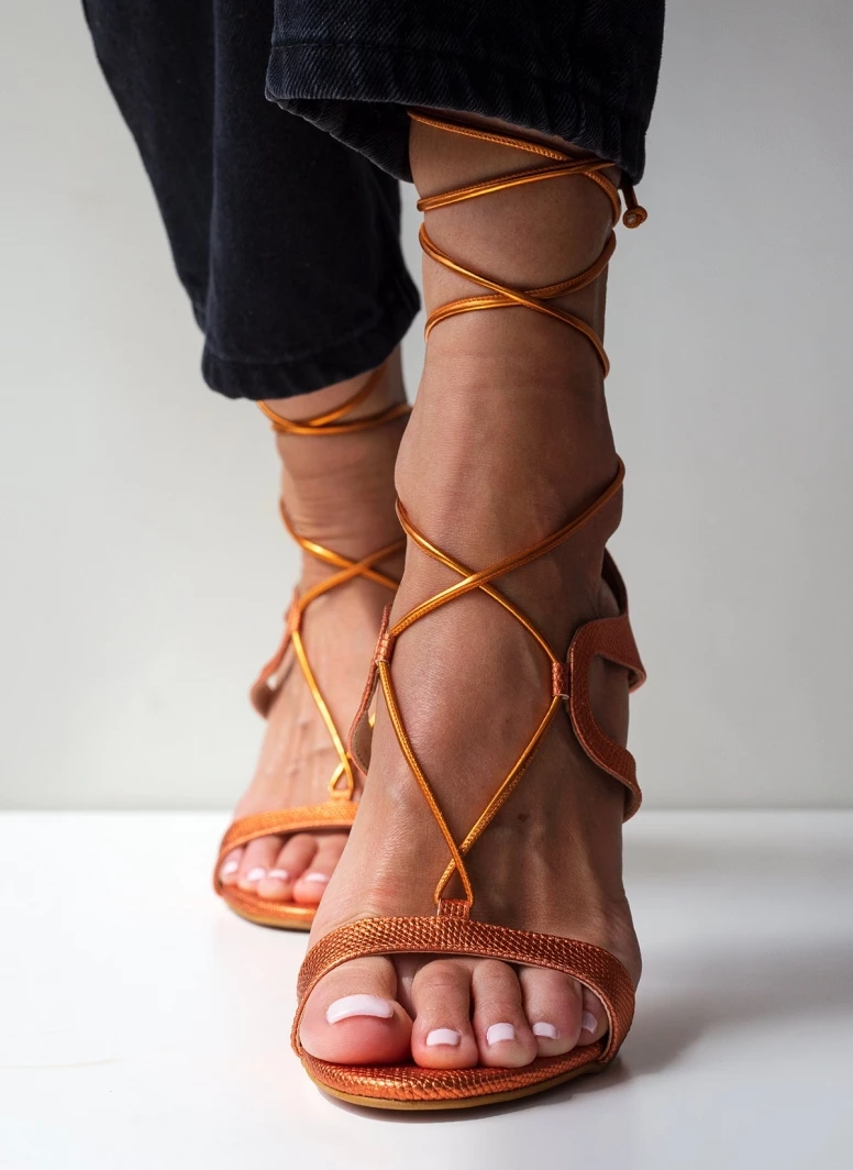 Πέδιλα με δέσιμο στη γάμπα.Έχουν κλειστή φτέρνα και ψηλό τακούνι.Ελληνικής κατασκευής.