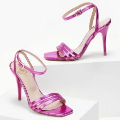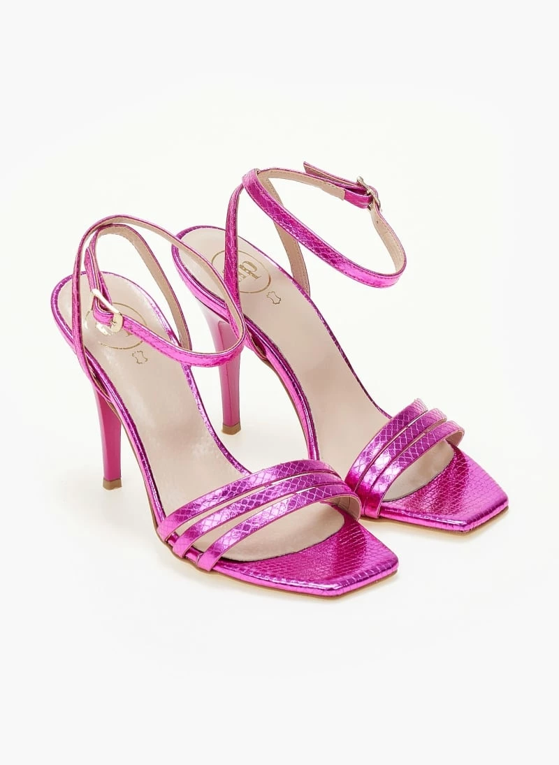 Πέδιλα TFP με λεπτά λουράκια και pattern φίδι. Δένουν με μπαρέτα στο ύψος του αστραγάλου. Έχουν λεπτό τακούνι. Καρέ γραμμή. Δερμάτινος πάτος. Ελληνικής κατασκευής.