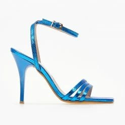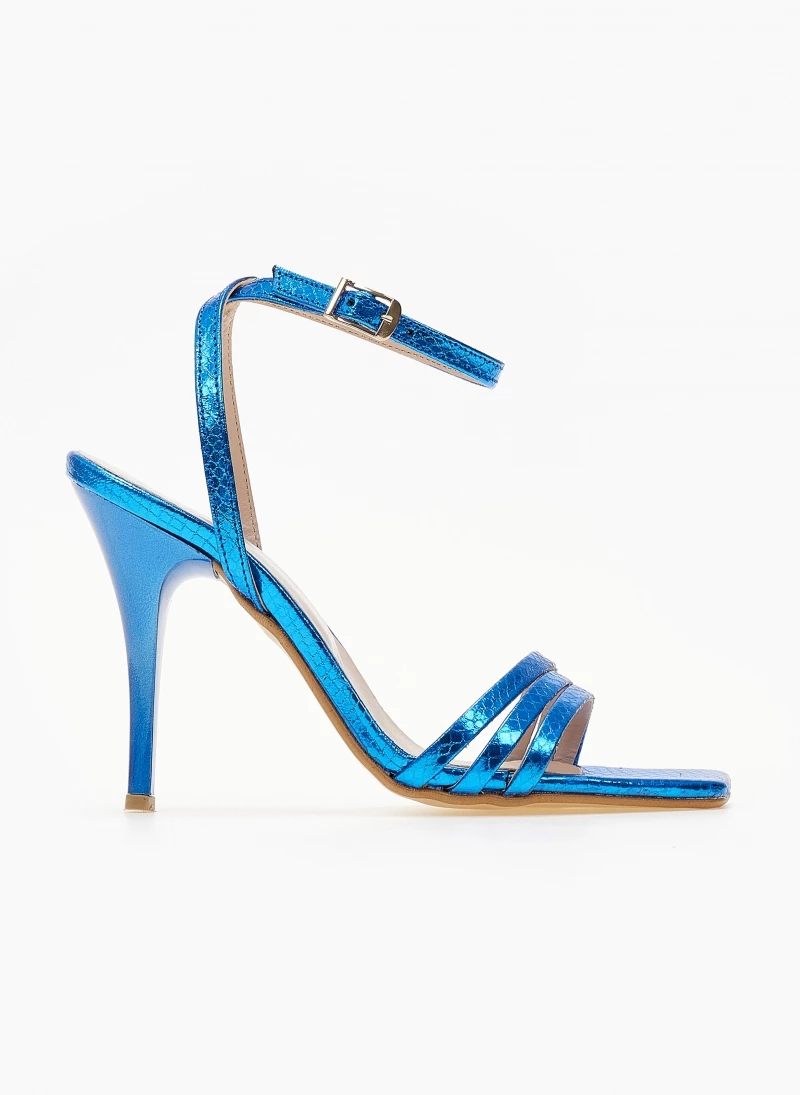 Πέδιλα TFP με λεπτά λουράκια και pattern φίδι. Δένουν με μπαρέτα στο ύψος του αστραγάλου. Έχουν λεπτό τακούνι. Καρέ γραμμή. Δερμάτινος πάτος. Ελληνικής κατασκευής.