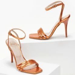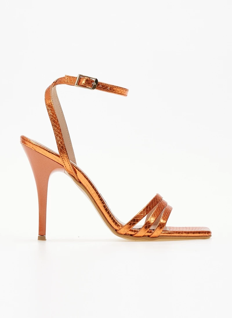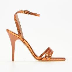 Πέδιλα TFP με λεπτά λουράκια και pattern φίδι. Δένουν με μπαρέτα στο ύψος του αστραγάλου. Έχουν λεπτό τακούνι. Καρέ γραμμή. Δερμάτινος πάτος. Ελληνικής κατασκευής.