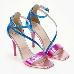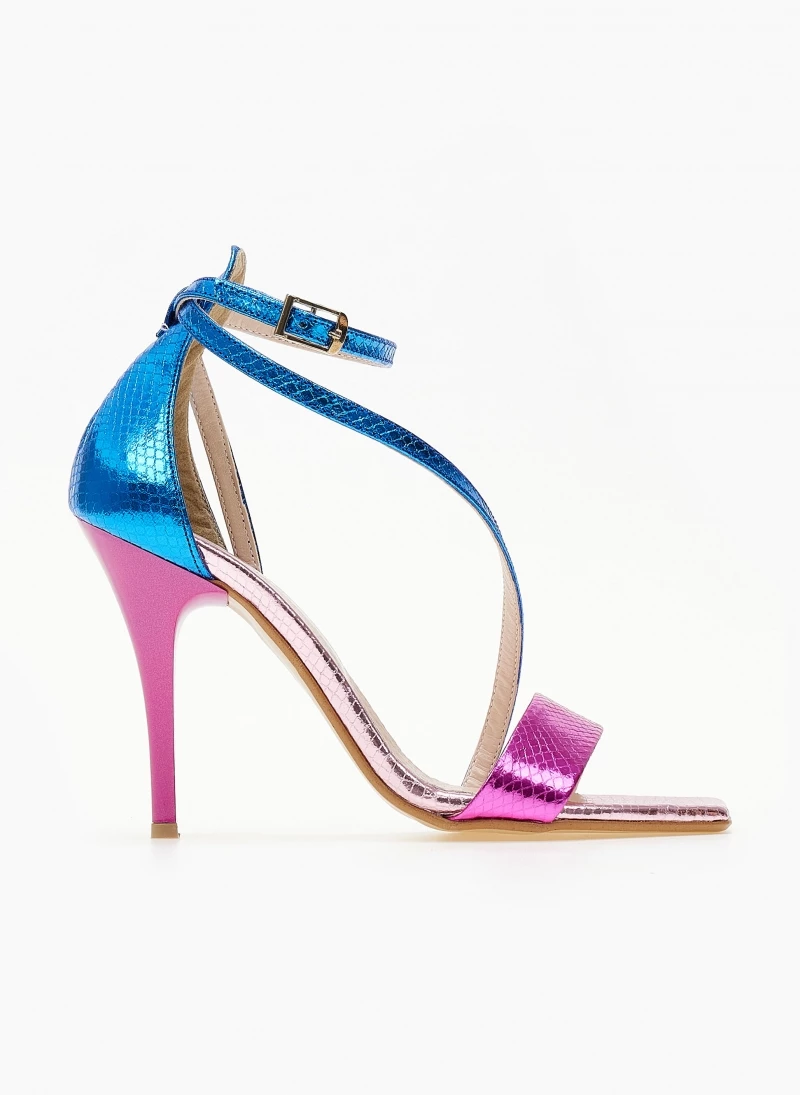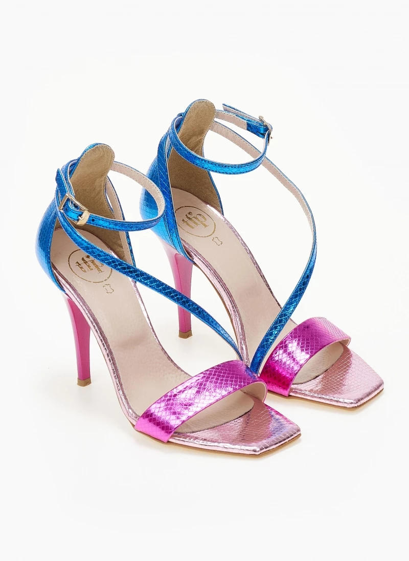Πέδιλα μεταλλιζέ με pattern φίδι. Έχουν κλειστή φτέρνα. Λεπτό ψηλό τακούνι. Δερμάτινος πάτος. Ελληνικής κατασκευής.
