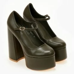 Γόβες platform Με ψηλή φιάπα και χοντρό τακούνι. Στρογγυλή γραμμή. Δένουν με μπαρέτα στο ύψος του κουτεπιέ.