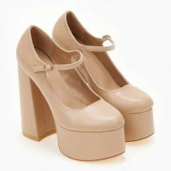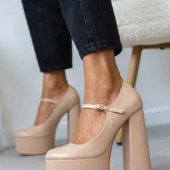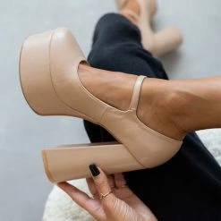 Γόβες platform Με ψηλή φιάπα και χοντρό τακούνι. Στρογγυλή γραμμή. Δένουν με μπαρέτα στο ύψος του κουτεπιέ.