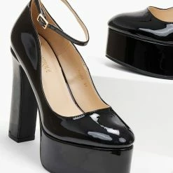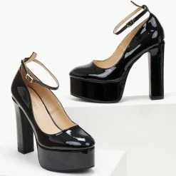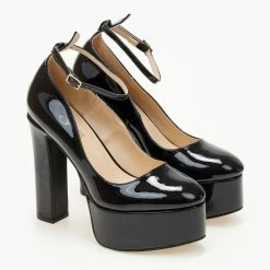 Γόβες platform λουστρίνι. Έχουν ψηλή φιάπα με φαρδύ τακούνι. Δένουν με μπαρέτα στο ύψος του αστραγάλου. Στρογγυλή γραμμή.