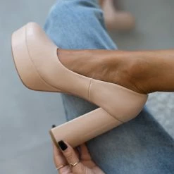 Γόβες σε στρογγυλή γραμμή με ψηλή φιάπα. Έχουν ψηλό τετράγωνο τακούνι.