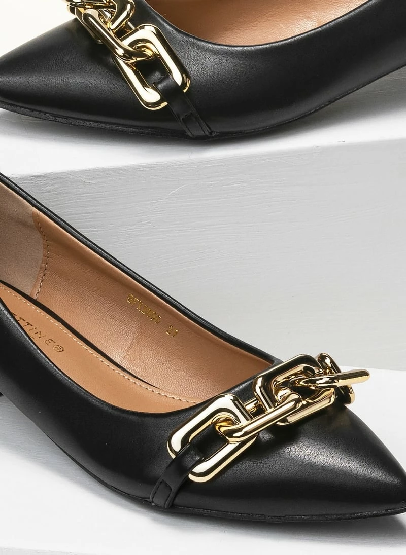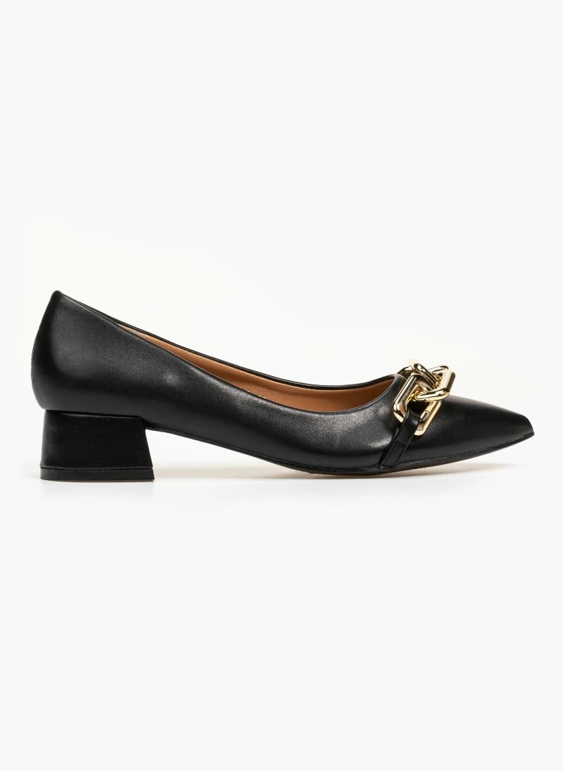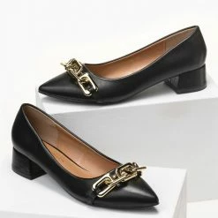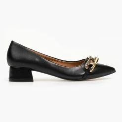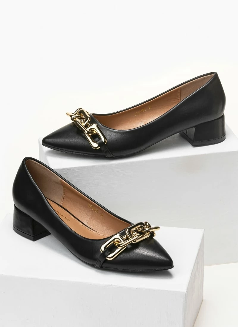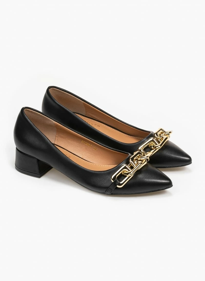 Μυτερά γοβάκια με αλυσίδα. Έχουν χαμηλό τετράγωνο τακούνι.
