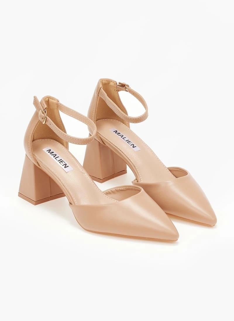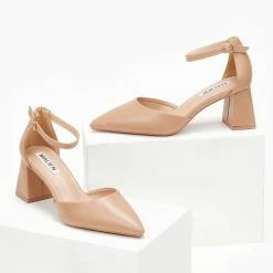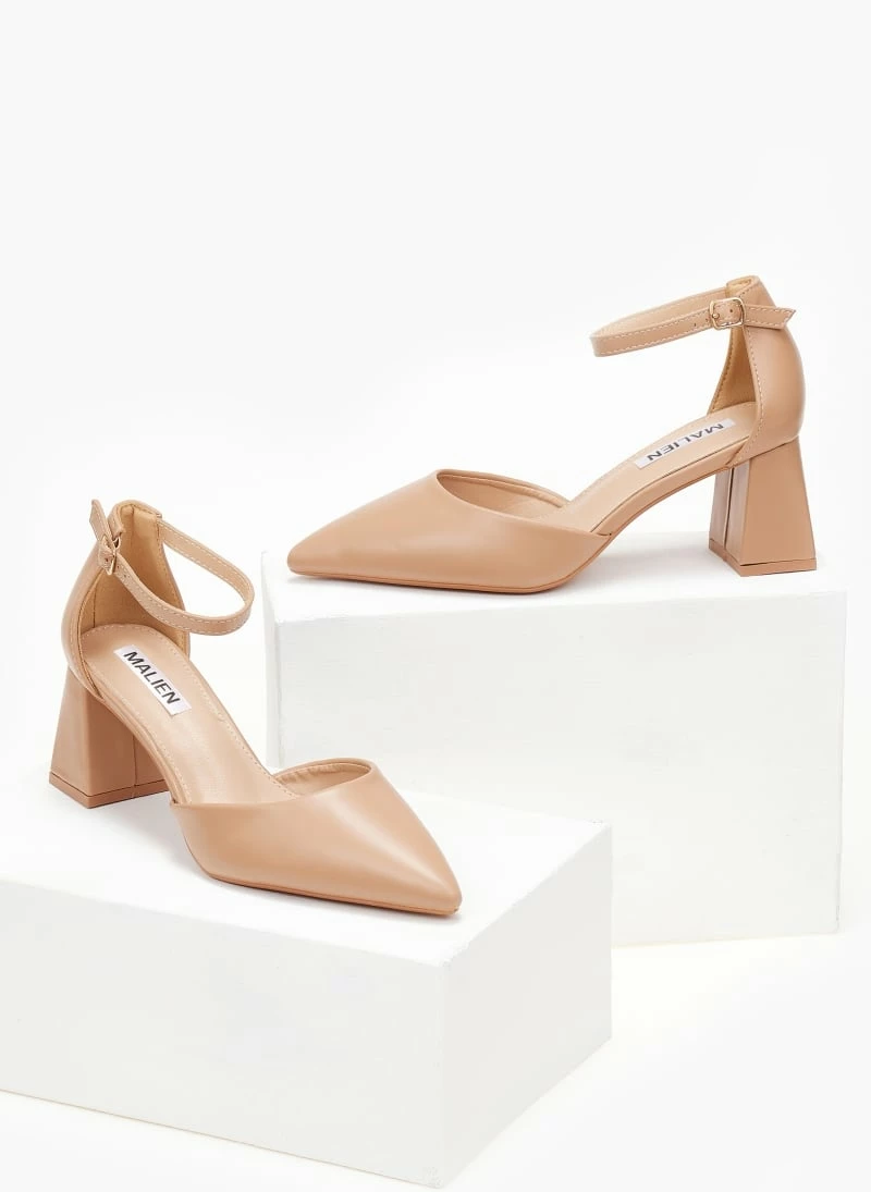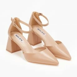 Γόβες μυτερές με ανοιχτά πλαΙνά. Έχουν κλειστή φτέρνα. Δένουν με μπαρέτα στο ύψος του αστραγάλου. Χαμηλό χοντρό τακούνι.