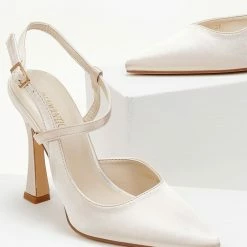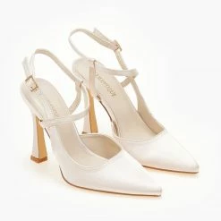 Ανοιχτές γόβες σατέν με ιδιαίτερο δέσιμο στο πλάι. Έχουν ψηλό ντυμένο τακούνι. Μυτερή φόρμα.