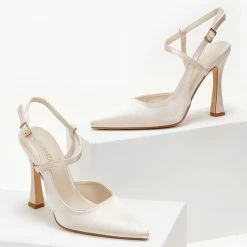 Ανοιχτές γόβες σατέν με ιδιαίτερο δέσιμο στο πλάι. Έχουν ψηλό ντυμένο τακούνι. Μυτερή φόρμα.