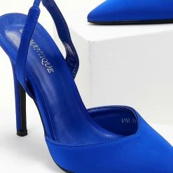 Γόβες σατέν μυτερές. Έχουν ανοιχτή φτέρνα και λουράκι με διακριτικό λάστιχο. Ψηλό λεπτό τακούνι.