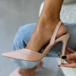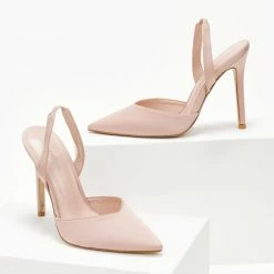 Γόβες σατέν μυτερές. Έχουν ανοιχτή φτέρνα και λουράκι με διακριτικό λάστιχο. Ψηλό λεπτό τακούνι.