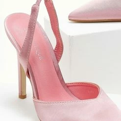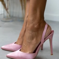 Γόβες σατέν μυτερές. Έχουν ανοιχτή φτέρνα και λουράκι με διακριτικό λάστιχο. Ψηλό λεπτό τακούνι.