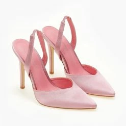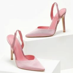 Γόβες σατέν μυτερές. Έχουν ανοιχτή φτέρνα και λουράκι με διακριτικό λάστιχο. Ψηλό λεπτό τακούνι.