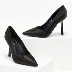 Γόβες σατέν σε μυτερή φόρμα. Έχουν λεπτό γυαλιστερό τακούνι.